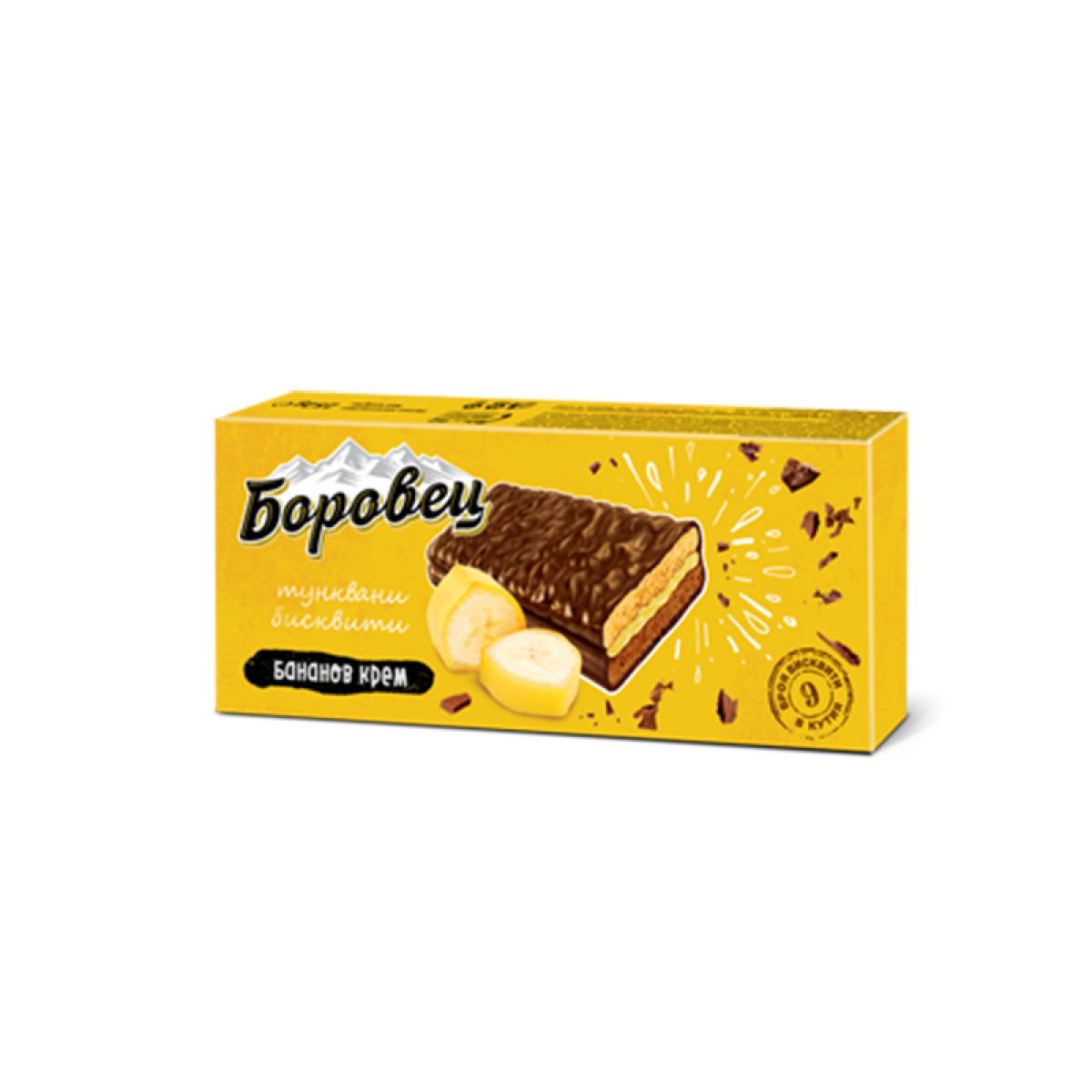 Състав: брашно, крем банан 25% [глюкозо-фруктозен сироп, вода, растително масло (палмово), захар, суроватка на прах, сгъстител: модифицирано нишесте (царевично), етилов алкохол, емулгатор: моно- и диглицериди на мастни киселини, консервант: калиев сорбат, киселина: лимонена, оцветител: бета каротен, банани на прах 0,1%, ароматизанти], какаова глазура 25% [захар, растително масло (палмово), обезмаслено мляко на прах, какао на прах с намалено маслено съдържание 1%, суроватка на прах, емулгатор: соев лецитин, ароматизант: ванилин], захар, растително масло (палмово), глюкоза, какао на прах с намалено маслено съдържание, суроватка на прах, сол, емулгатор: соев лецитин, набухватели (натриев хидроген карбонат, амониев хидроген карбонат, натриев кисел пирофосфат), ароматизанти.