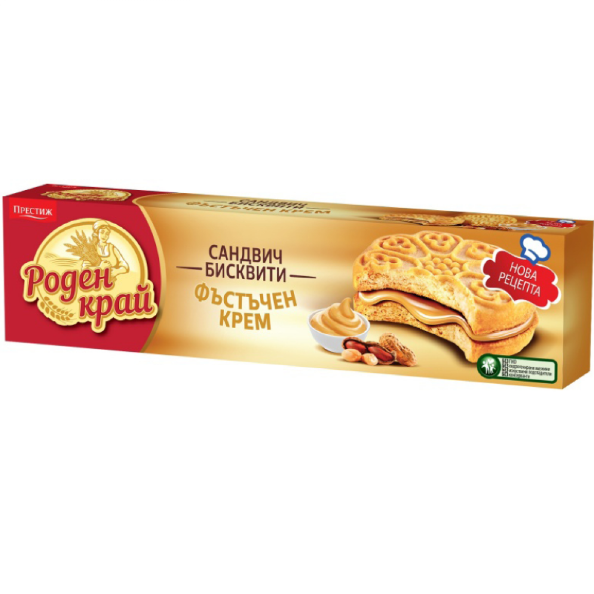 Състав: пшенично брашно 62%, нехидрогенирани растителни мазнини (палмова и ший, емулгатор- моно и диглицериди на мастни киселини, ароматизант, оцветител- бета каротин), захар, суроватка на прах, царевично нишесте, регулатор на киселинността- лимонена киселина, дехидратирано млечно масло-1,2%, фъстъчен крем, сол, набухватели (натриев бикарбонат, амониев бикарбонат, кисел натриев пирофосфат), емулгатор (рапичен лецитин), ароматизант. Може да съдържа следи от фъстъци, сусамово семе, мляко, соев продукт, мляко и ядки (лешници, орехи, пеканови ядки).