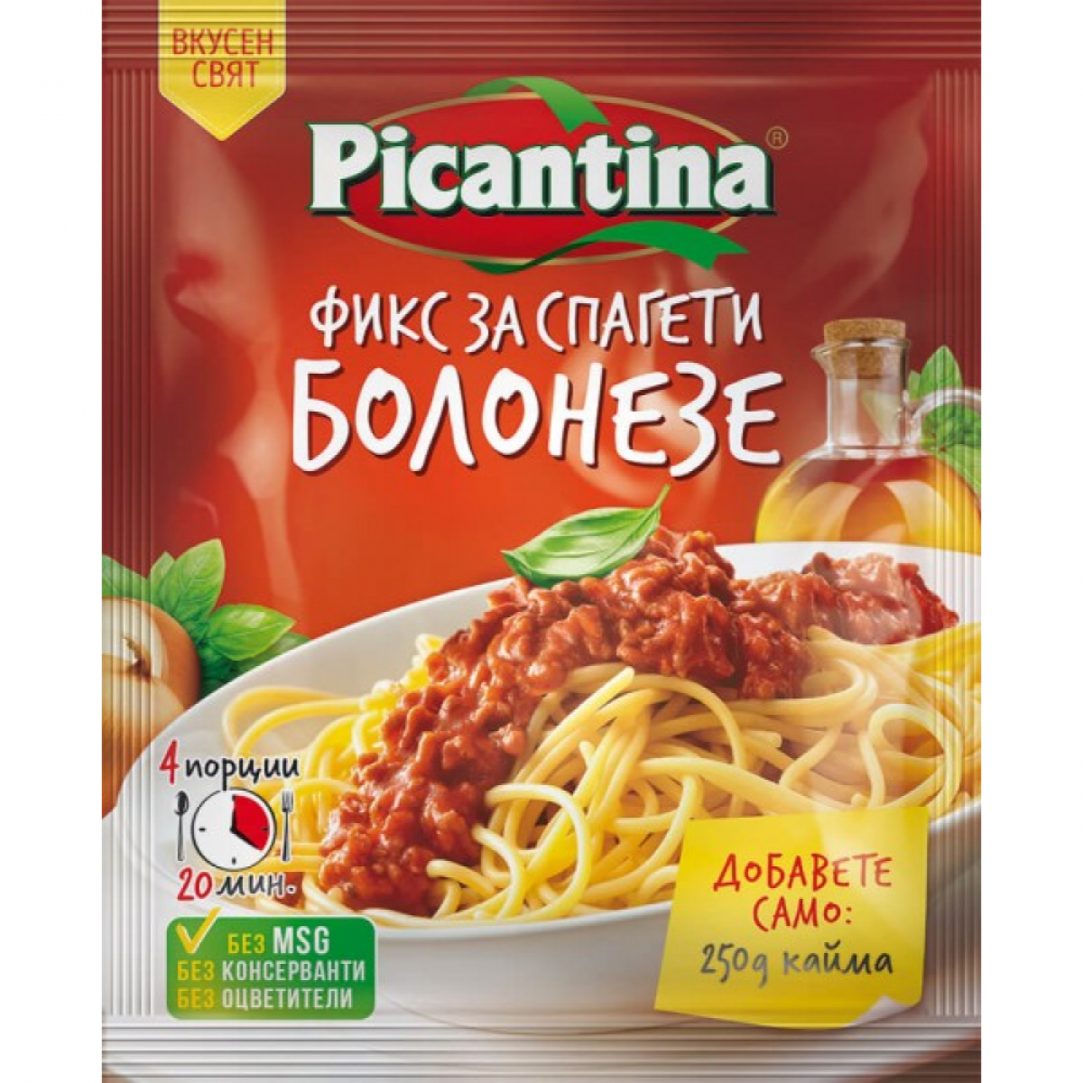 Състав: Сушени зеленчуци 39,26 % (домати на прах и парчета, лук прах и парчета, чесън прах), пшенично брашно*, нишесте (картофено, оризово), подправки 10,56 % (червен пипер, риган, босилек), йодирана сол,захар, зехтин на прах (лактоза**, аскорбил палмитат), смес песто (босилек, чесън, сол, оризово брашно, захар, сирене пекорино***, слънчогледово олио, дрождиев екстракт, силициев диоксид (екстракт от мая, аромати). *съдържа глутен *съдържа лактоза и млечен протеин.