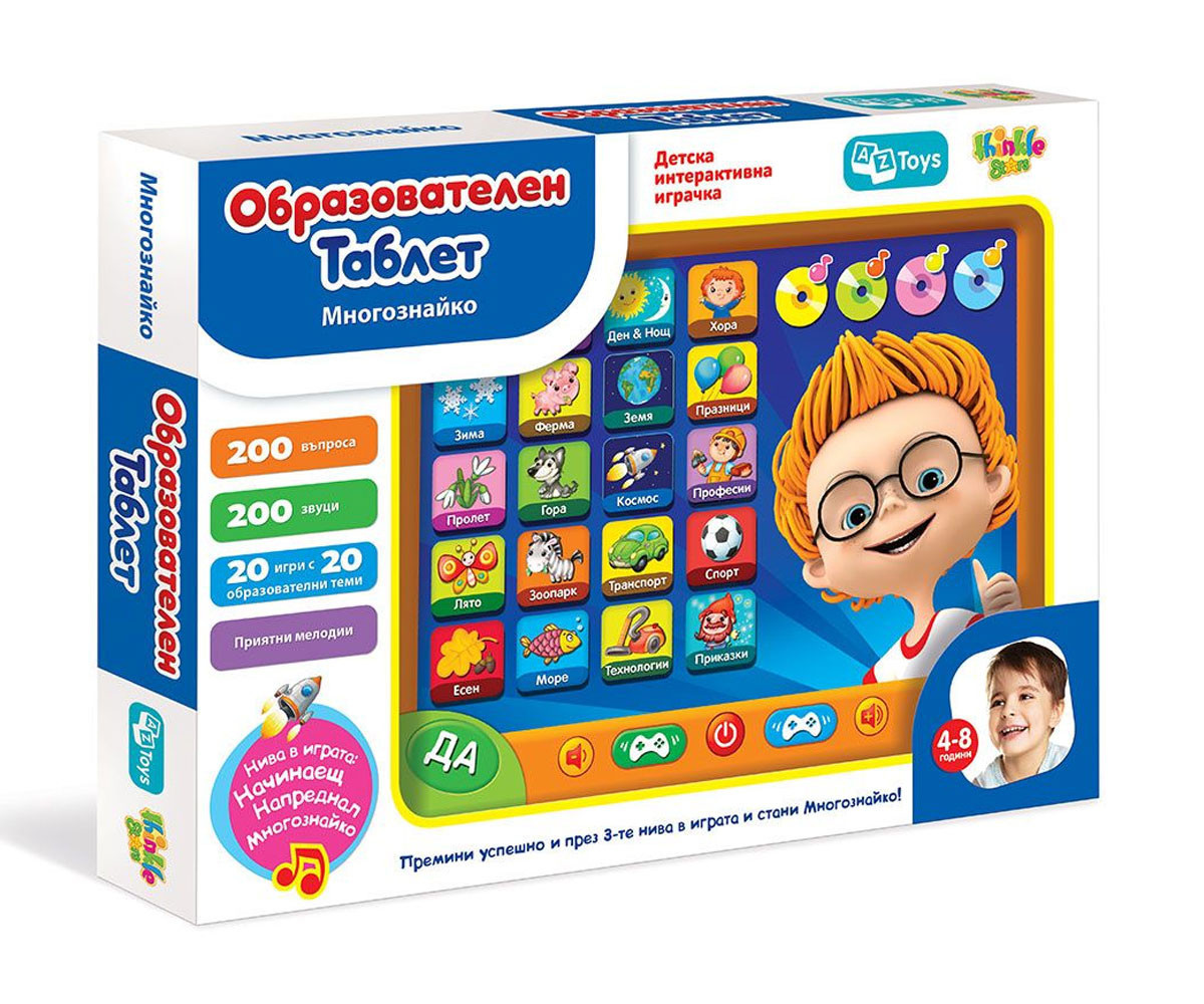 Интерактивна образователна играчка на български език. Задава 200 въпроса от 20 различни теми - природа, сезони, космос, домашни любимци, спорт, технологии и др., издава 200 звука и мелодии, съдържа 20 игри с 20 образователни теми. Нива на трудност: начинаещ, напреднал и многознайко.
