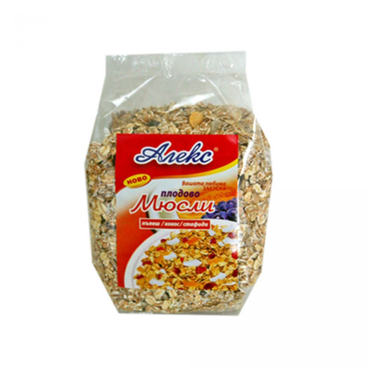Състав: 50% овесени ядки, ядки и семена (орехи, кашу, слънчогледови семки, ленено семе, сусамово семе, тиквени семки), сушени плодове (кайсии, червени боровинки, стафиди и бананов чипс)