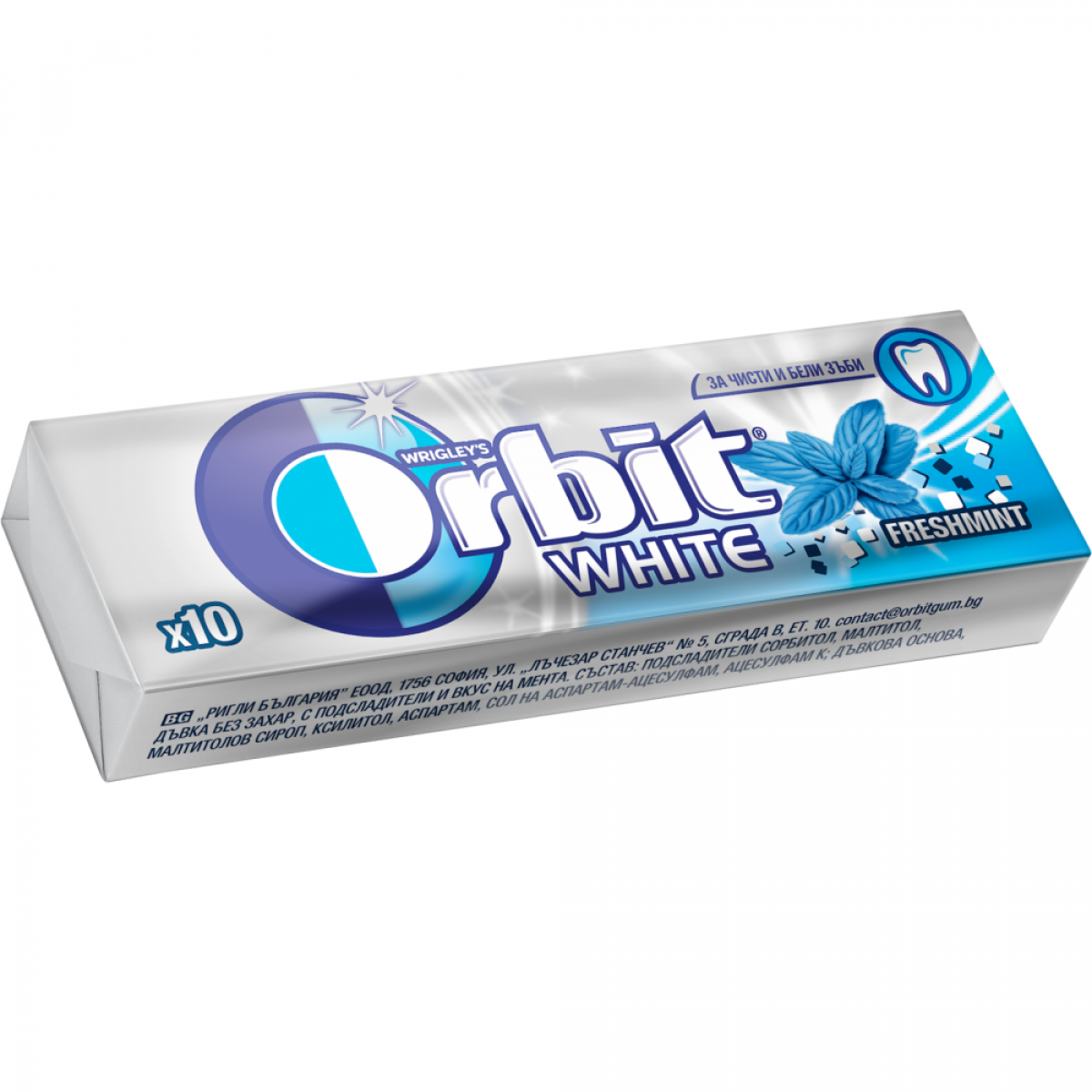 Състав: подсладители сорбитол, ксилитол, манитол, аспартам,ацесулфам к, дъвкова основа,сгъстител гума арабика, ароматизанти, влагозадържащ агент глицерол, лимонена киселина, емулгатор соев лецитин, ябълчена киселина, оцветител Е171, глазиращ агент карнауба восък, антиоксидант бха.