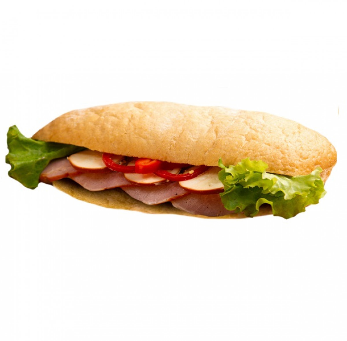 Състав: чабата, жарен свински бут, топено пушено сирене, чушка, айсберг, майонеза.