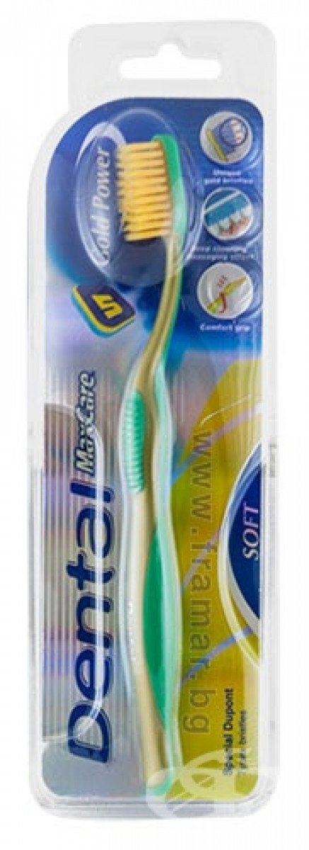 Dental Max Care Gold Power е високотехнологична четка за зъби, изработена по специална технология чрез добавяне на чисто злато във влакната. Изтънените снопчета осигуряват почистването не междузъбните пространства. По-късите меки снопчета масажират нежно венците. Благодарение на твърдата гумена част на дръжката, направлявате посоката на четката с лекота, а меката гумена част осигурява удобство и предотвратява изплъзването.