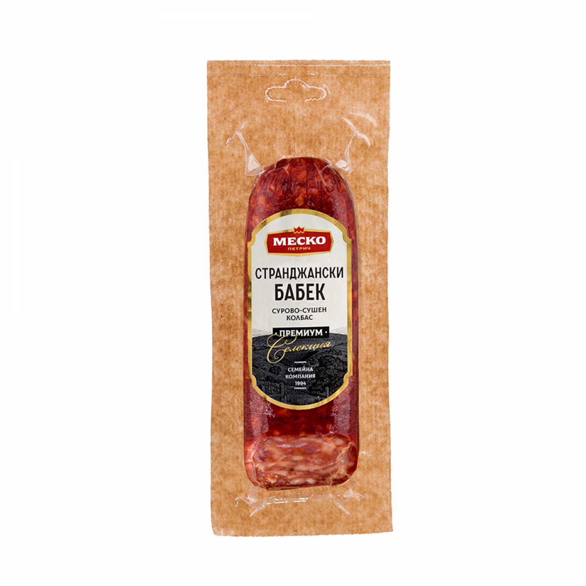 Състав: свинско месо 100%, сол до 3%, консервант Е250, антиоксиданти Е300, Е301, смес от подправки, захари.