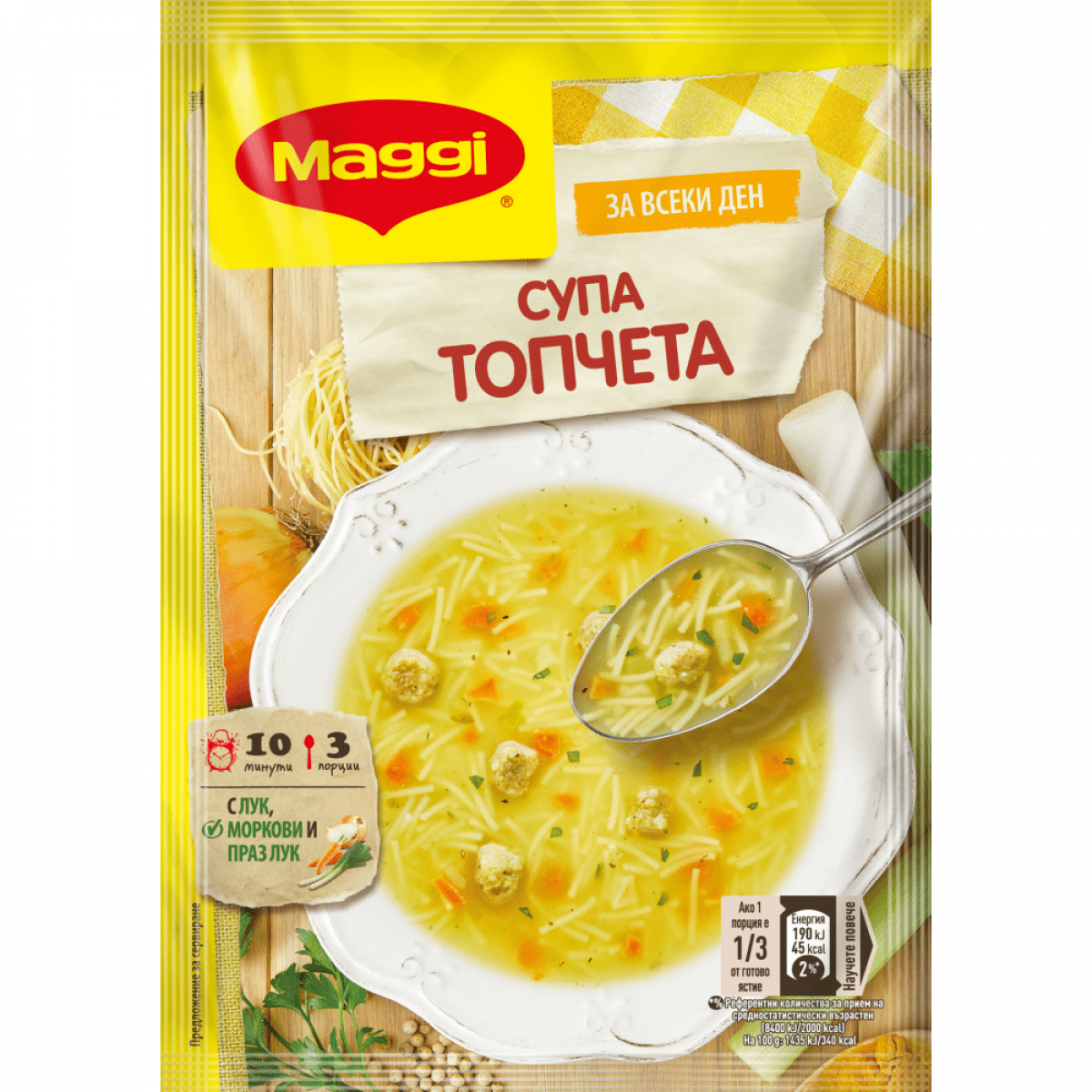 Супа топчета на MAGGI® е деликатна и нежна. Наситеният й вкус е допълнен от крутони. Една чаша от нея ще ви стопли и засити.
