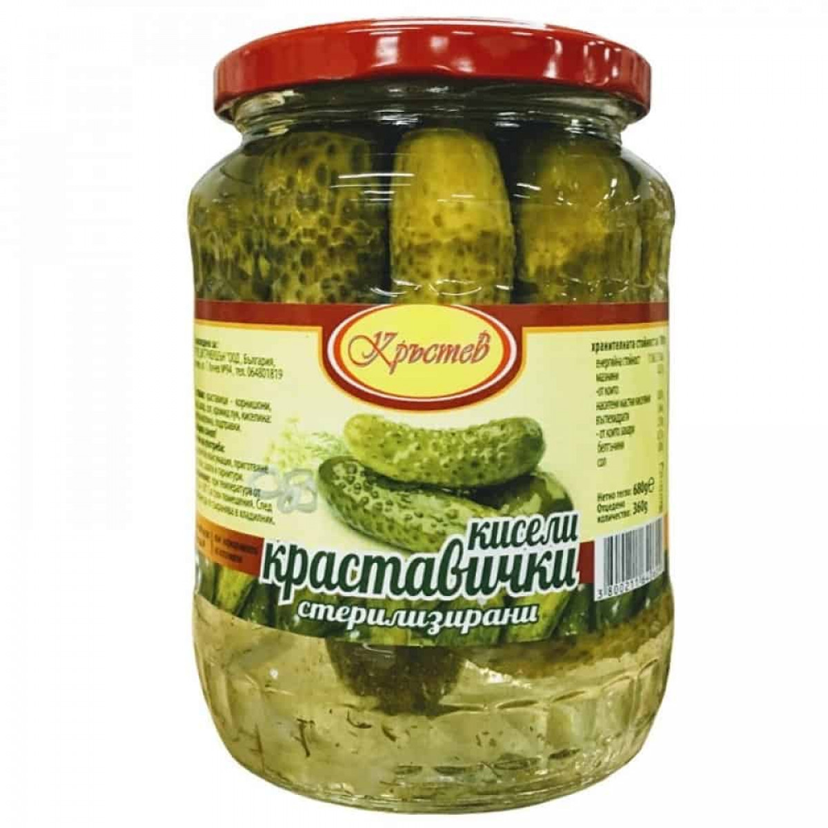 Състав: краставички 55%, Вода 38%, сол, захар, регулатор на киселиността, оцетна киселина, подправки, копър
