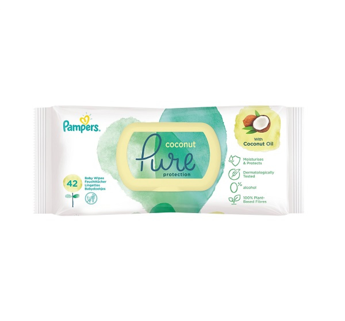 Памперс Пюр Мокри кърпи с кокосово олио са изработени от органичен памук и фибри на растителна основа, което ги прави изключително подходящи за чувствителната и деликатна бебешка кожа.