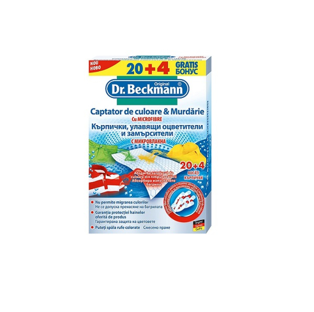 Новите цветоулавящи микрофибърни кърпички на Д-р Бекман действат по-бързо и по-ефективно от всякога. Особено фините влакна на микрофибъра осигуряват по-голяма действаща повърхност, която абсорбира повече цветни и мръсни частици и затова защитава по-добре от оцветяване на прането.