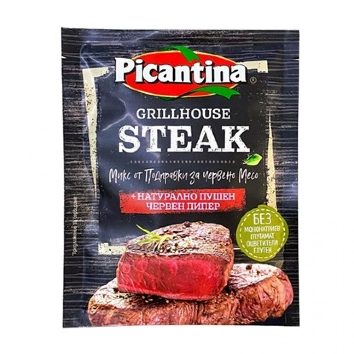 Picantina GRILLHOUSE STEAK е готова подправка за барбекю и скара. Смес от подбрани билки и подправки, които ще овкусят приятно вашите пържоли, котлети, ребра, филе. Подходяща за гриловане на свинско, телешко или говеждо месо.