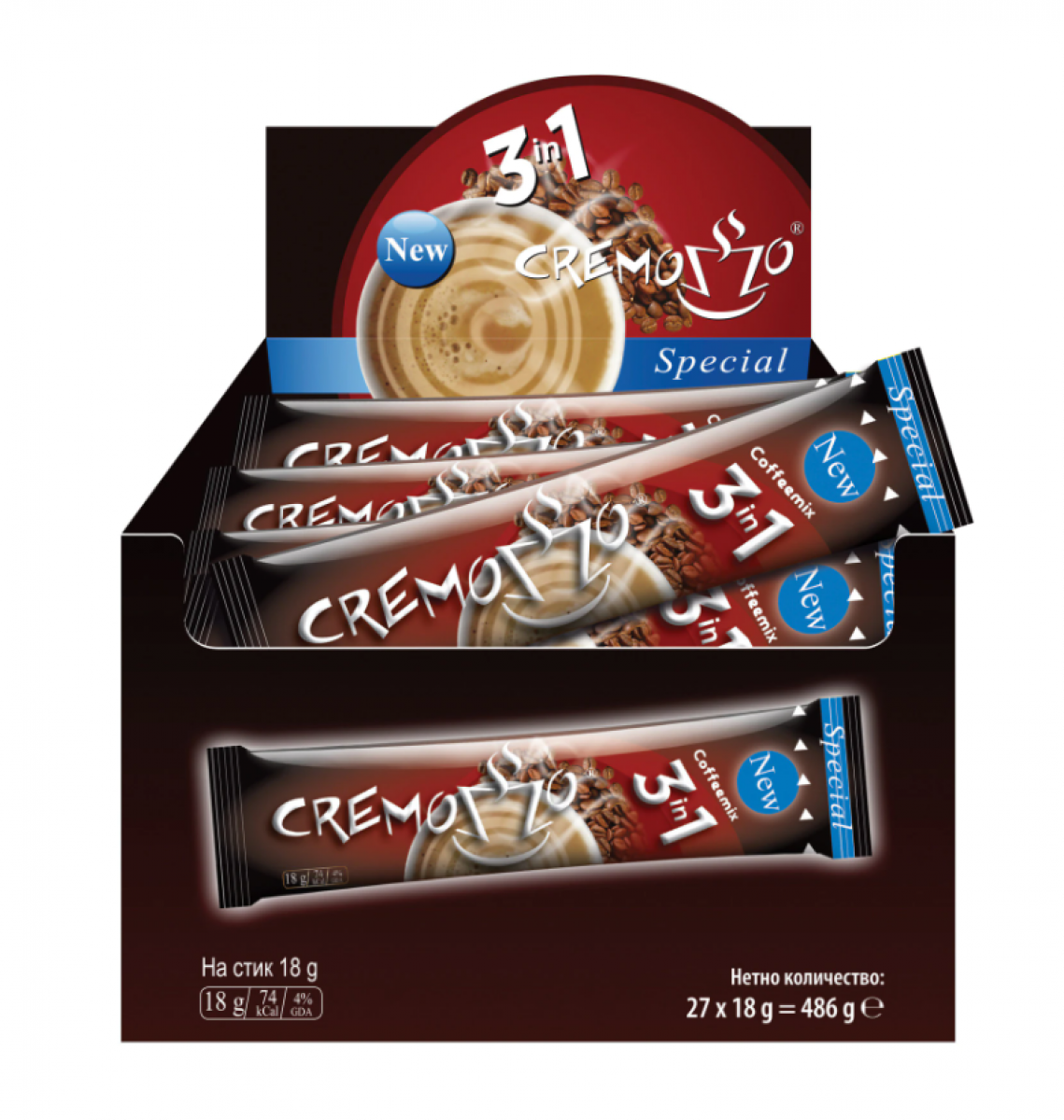 Инстантно кафе Cremozzo 3in1- комбинация от вкус и аромат с усещане за пълно удоволствие. Подбраните висококачествени съставки гарантират най-добър продукт. Плътният и нежен вкус придава тонус за целия ден. Предлага се в луксозна опаковка.