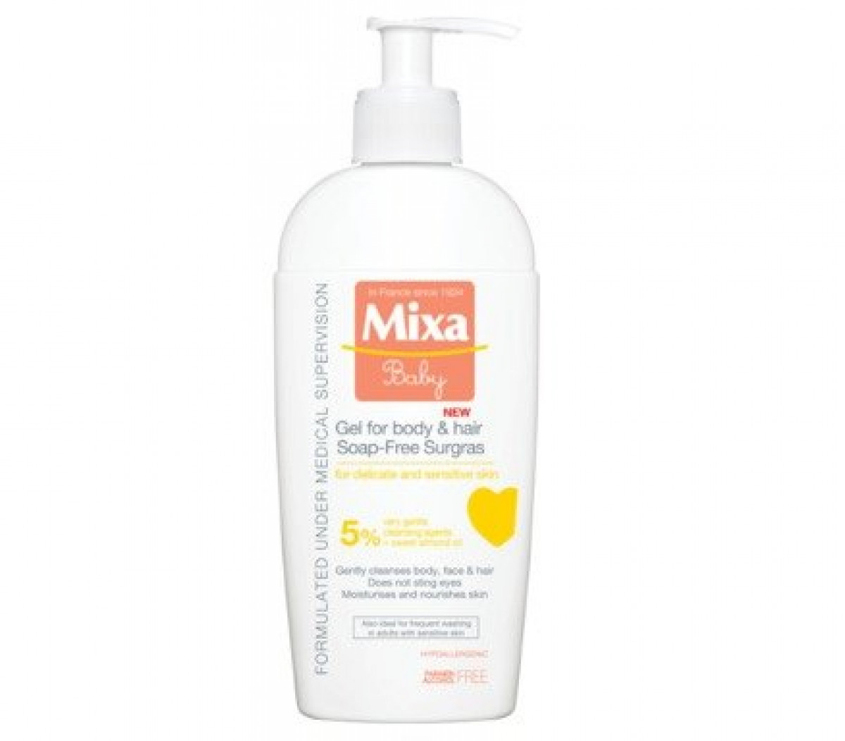 Микса Бейби е богат на липиди гел за тяло и коса за бебета без сапун. Той хидратира и трайно предпазва от изсушаване деликатна детска кожа, благодарение на възстановяващите свойства на Алантоина и на хидратиращите свойства на Глицерина. Използван редовно върху косата възпрепятства ефикасно появата на млечни корички по скалпа на бебето. Подходящ за честа употреба и за възрастни с чувствителна кожа. Душ-гелът Mixa овлажнява и подхранва кожата, благодарение на специално разработената си формула, подходяща за отстраняване на замърсяванията от кожата и косата.