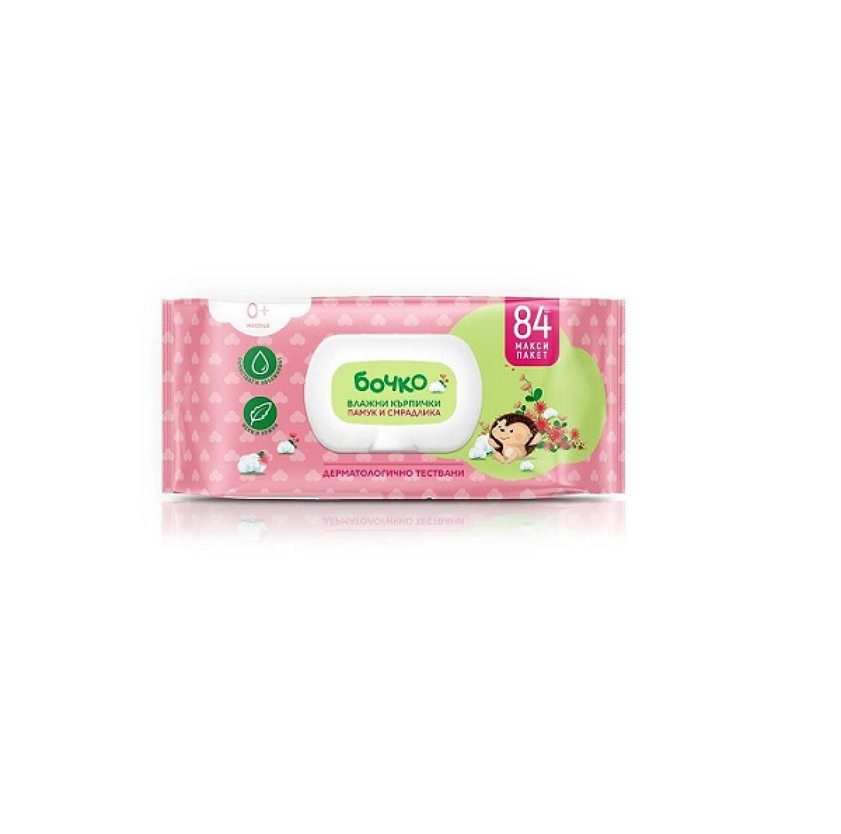 Влажните кърпички Бочко са предназначени за хигиена на бебешка и детска кожа. Идеални при смяна на пелените, при разходка, по време на пътуване, игри и хранене. Подходящи за честа употреба. Напоени с мек лосион на водна основа, с деликатен аромат и с балансирано рН. Без спирт, оцветители и други дразнещи съставки. С включени ценни растителни екстракти. Екстрактът от памук подхранва и омекотява, а екстрактът от лавандула действа антисептично и успокояващо. Лосионът на влажните кърпички Бочко съдържа още растителен глицерин, витамин Е и пантенол – за защита, възстановяване и грижа за влажността на деликатната бебешка кожа. Изработени от мек текстил с добавен релеф за по-лесно почистване и нежен допир по време на използване.