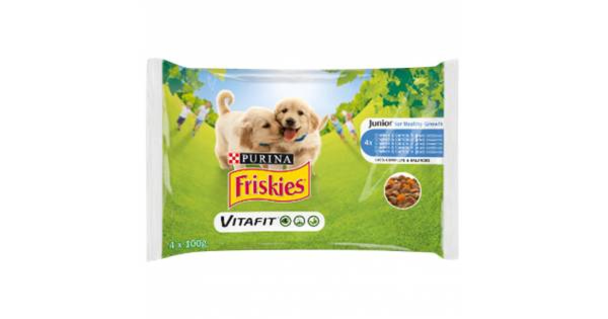 Съставки: Месо и животински производни (39%. ), зърнени храни, зеленчуци (включително 0.8% микс от изсушени моркови и грах. еквивалентно на 4% микс от моркови и грах), зеленчукови протеинови екстракти, минерали, производни от зеленчуков произход (включително 0.5% изсушена пулпа отцвекло), масла и мазнини (включително 0.5% слънчогледово олио).