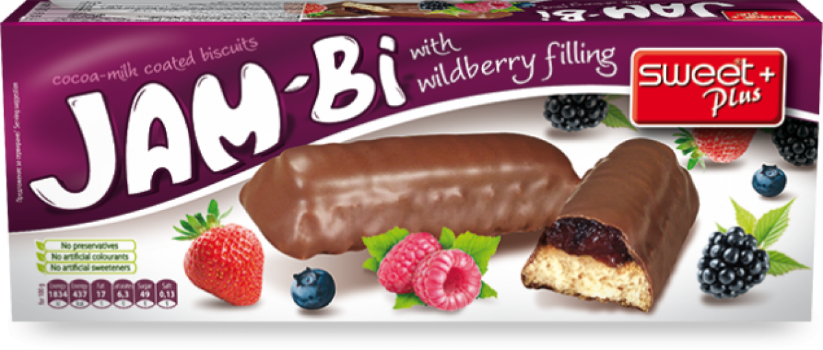 Състав: пшенично брашно, плодов пълнеж горски плод 24% [глюкозо-фруктозен сироп, боровинки 15%, ягоди 10%, ябълково пюре, захар, сгъстител: нишесте, желиращ агент: пектин, регулатор на киселинност: лимонена киселина, консервант: калиев сорбат, оцветител: антоцианин, ароматизант], какаова глазура 24% [захар, растително масло (палмово), обезмаслено мляко на прах, какао на прах с намалено маслено съдържание 2%, суроватка на прах, емулгатор: соев лецитин, ароматизант], захар, растително масло (палмово), глюкозен сироп, обезмаслено мляко на прах, набухватели (натриев хидроген карбонат, амониев хидроген карбонат), емулгатор: естери на моно- и диацетилна винена киселина с моно- и диглицериди на мастни киселини, сол, ароматизант.