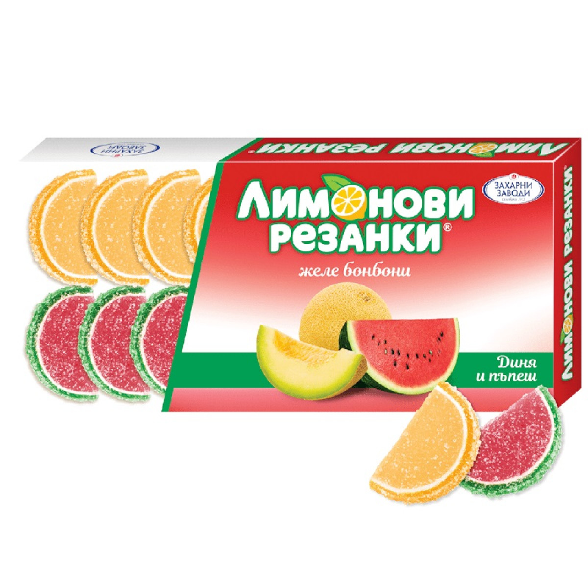 Състав: Захар, глюкозен сироп, вода, желиращ агент: агар; киселина: лимонена; оцветители (титанов диоксид, бета-апо-8-каротенал, каротини), ароматизанти 0,1% диня и пъпеш.