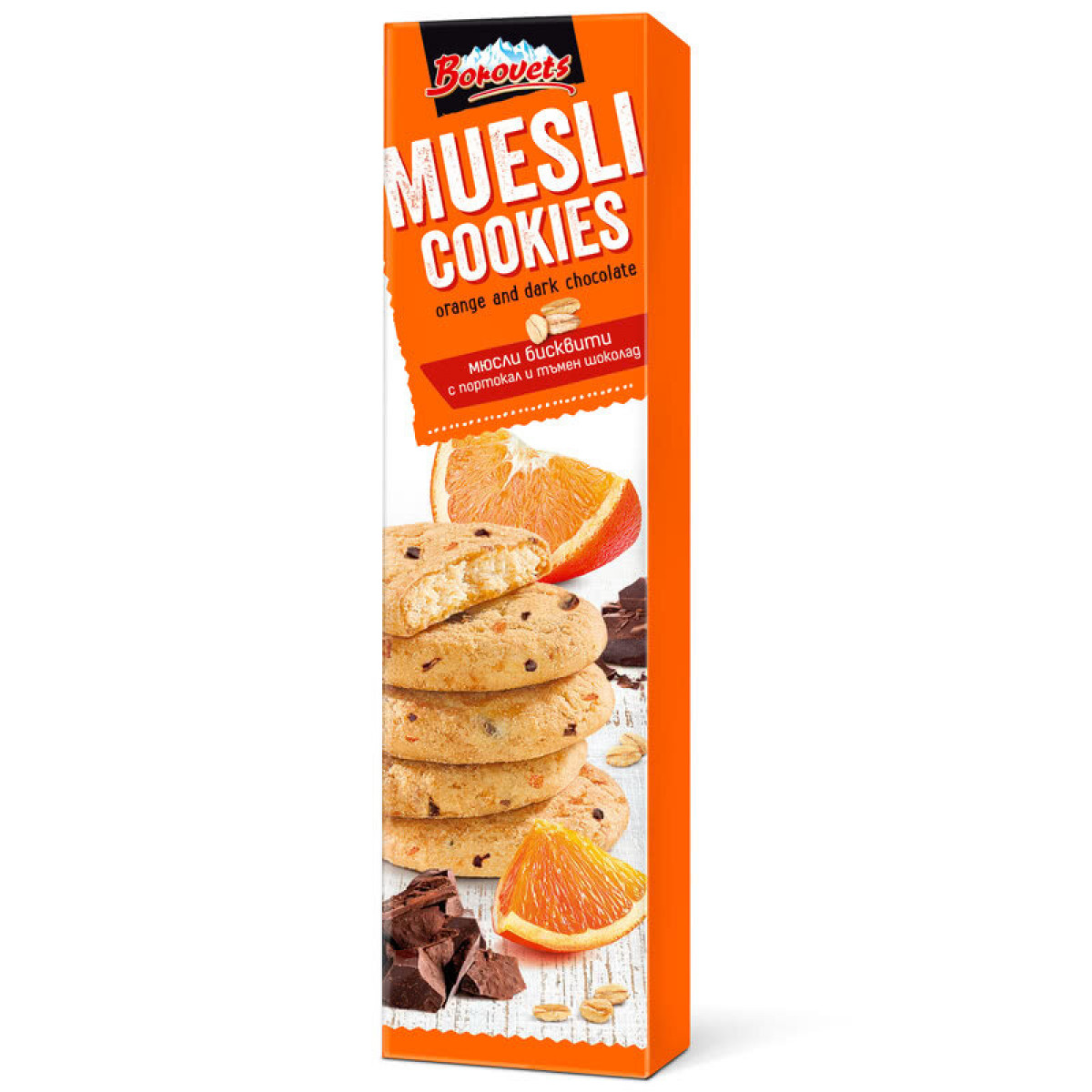 Състав: Бяло пшенично брашно, растително нехидрогенирано масло (палмово), захар, овесени ядки 14%, шоколад на капки 4% (захар, какаова маса, какаово масло, емулгатор: Е322 соев лецитин, ароматизант ванилия. Съдържание на обща суха какаова маса: не по-малко от 45%, портокалови корички 3%, обезмаслено мляко на прах, емулгатор: (естери на моно и диацетилна винена киселина с моно диглицериди на мастни киселини), набухватели: (натриев бикарбонат, амониев бикарбонат), сол, ароматизант ванилия.