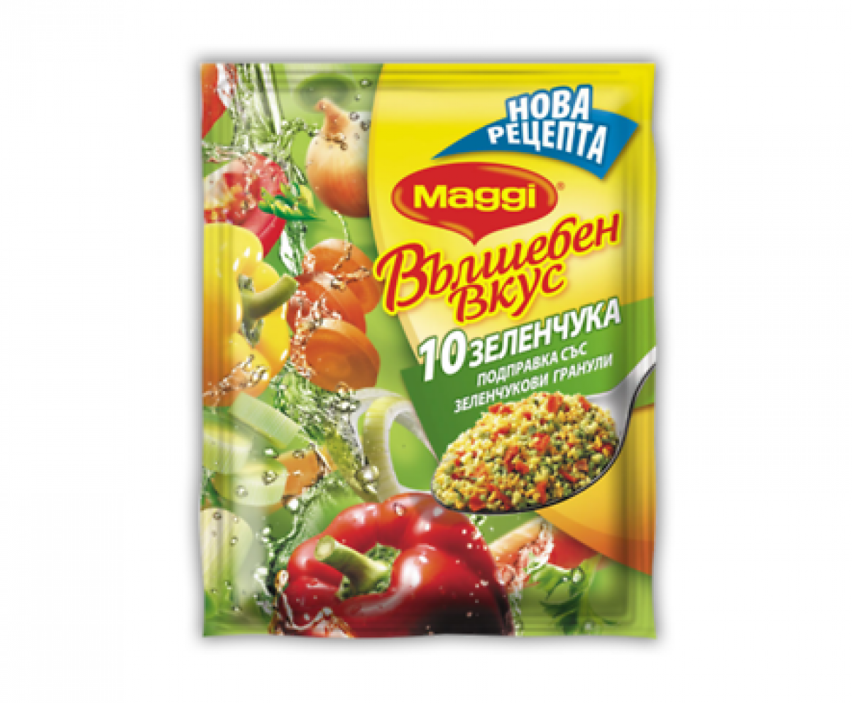 Благодарение на богатия си аромат и парченцата зеленчуци в нея, подправката MAGGI® Вълшебен вкус 10 Зеленчука е перфектно допълнение към твоето ястие, било то супа, гювеч или паста.