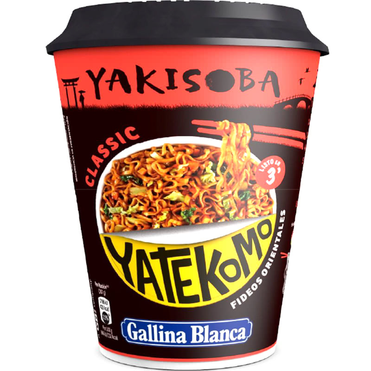 Състав: Ориенталско фиде (79%): пшенично брашно, палмово масло, модифицирано нишесте, сол, газификатори (натриев карбонат, калиев карбонат). Течен сос (17%): Соев сос 7.6% (вода, соя, пшеница, сол), слънчогледово олио, оцветители (E150a), захар, подобрители