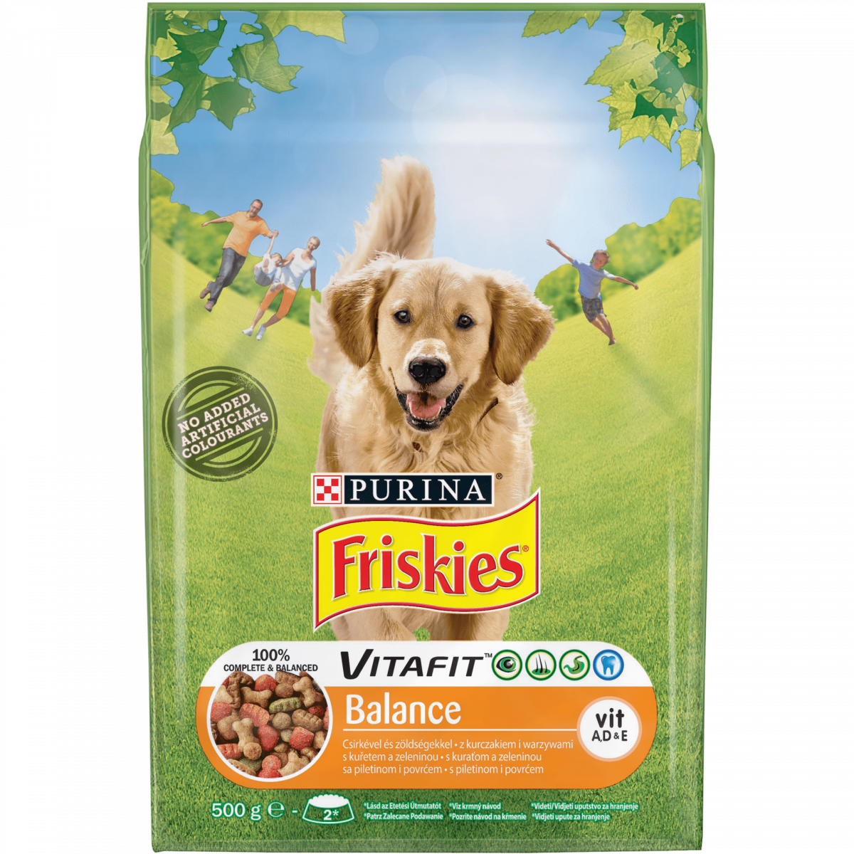 FRISKIES® Balance е източник на висококачествени протеини и всички останали хранителни вещества, от които кучето Ви се нуждае, за да има щастлив и пълноценен живот. Предоставя 100% от хранителните вещества, нужни на Вашето куче в зряла възраст всеки ден, висококачествени протеини за идеална форма, фибри за добро храносмилане и Антиоксиданти за подсилване на естествените защитни сили - и не съдържа добавени изкуствени оцветители, овкусители и консерванти.