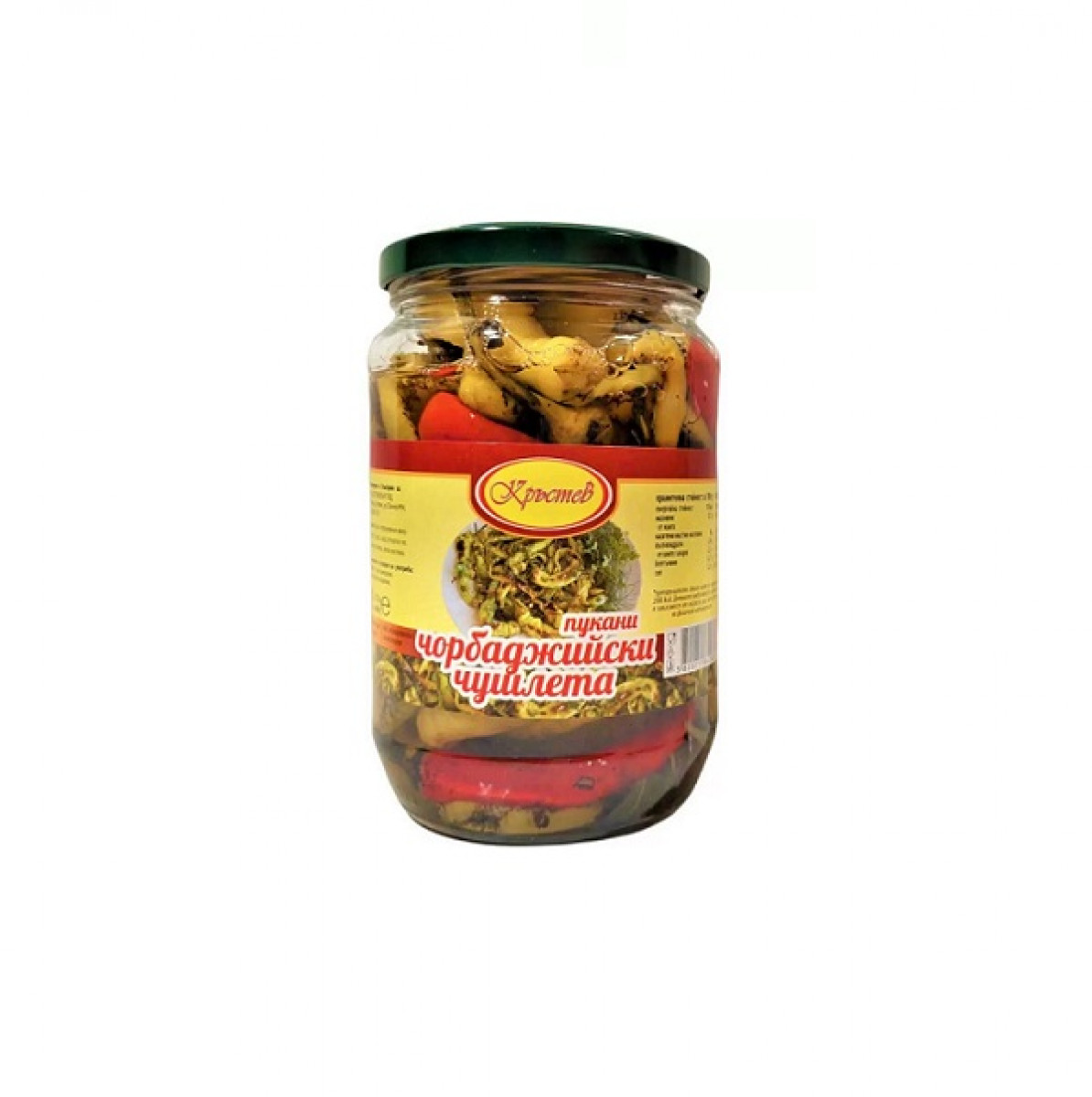 Състав: Пукан чорбаджийски пипер - произход ЕС, вода, захар, готварска сол, киселинен регулатор: оцетна киселина.