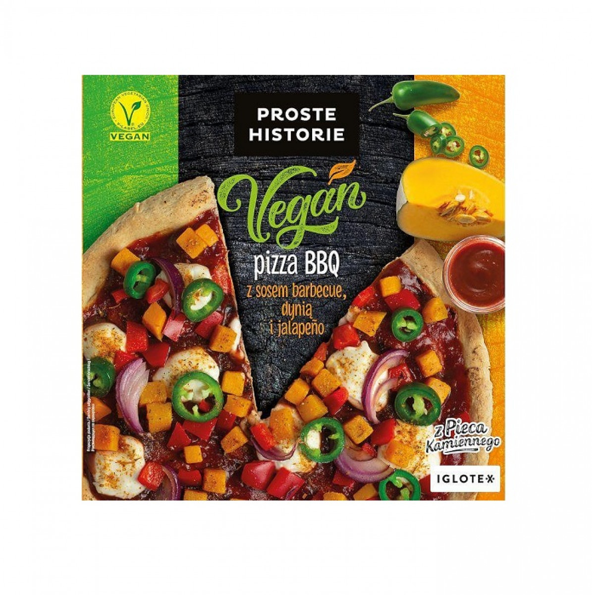 Пица с барбекю сос (17%), тиква и мариновани чушки халапеньо, върху препечена основа. Дълбоко замразен продукт.