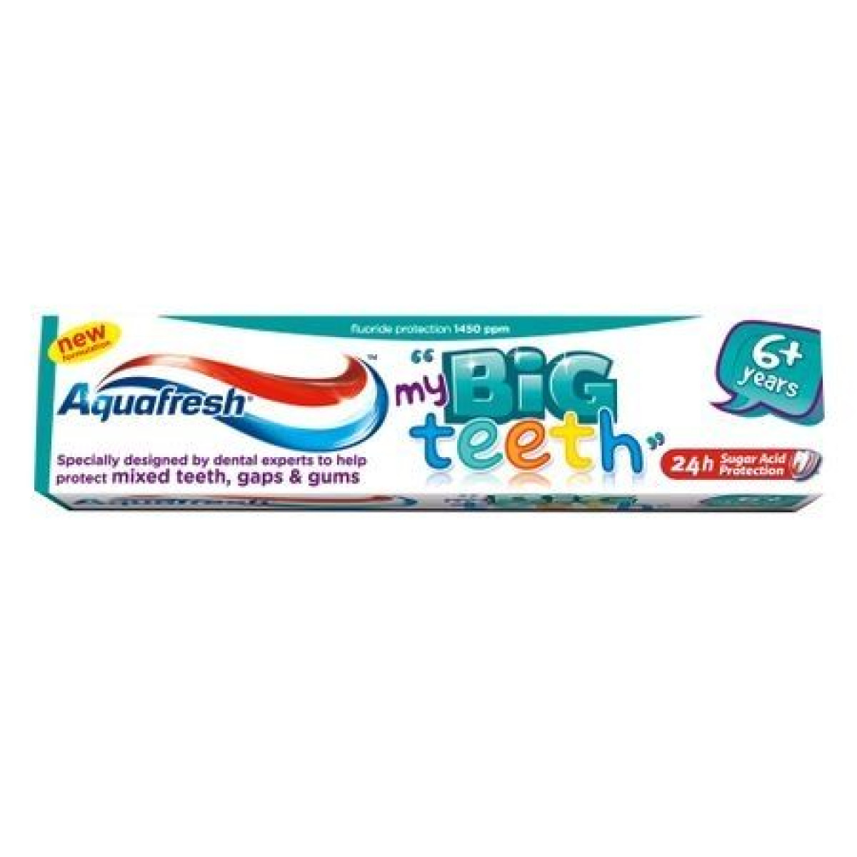 Пастата за зъби Аquafresh Big Teeth e nенеща се паста с тройна защита, специално разработена от дентални експерти за деца от 6 до 8 години.