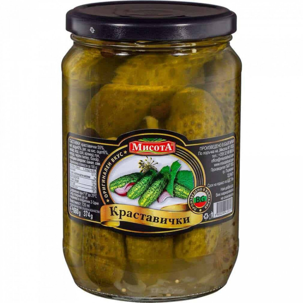 Състав: краставички 55%, Вода 38%, сол, захар, регулатор на киселиността, оцетна киселина, подправки, копър