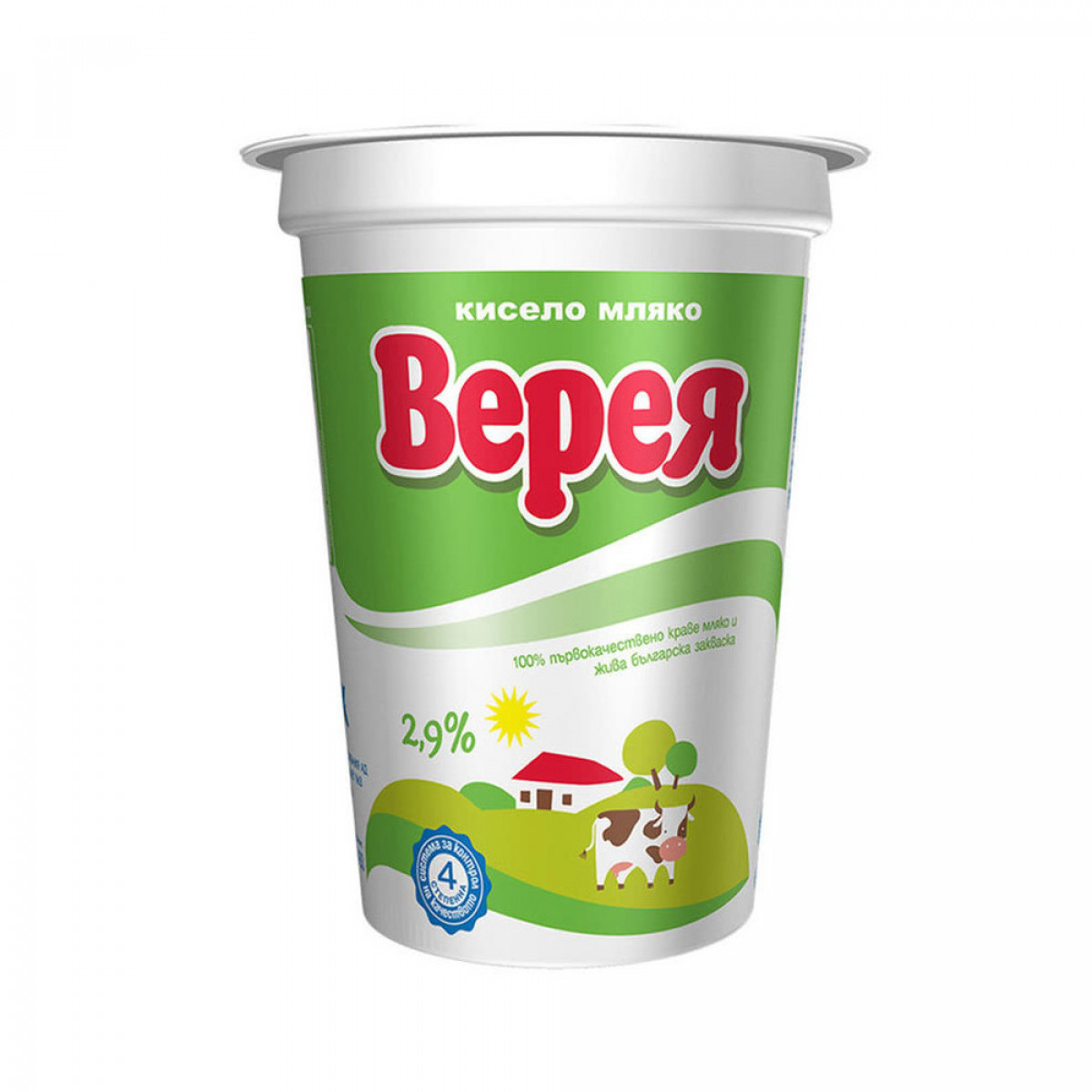 В кисело мляко Верея са запазени всички хранителни свойства и полезни вещества на първокласен свеж млечен продукт. От винаги висококачествено сурово фермерско мляко и със закваска комбинация от специално избрани и следени щамове е произведено кисело мляко в най-хигиенни условия, за да се запази полезността му и да се подсигури максимално възможната му дълготрайност. Предлага се в популярна опаковка кофичка с капачка.