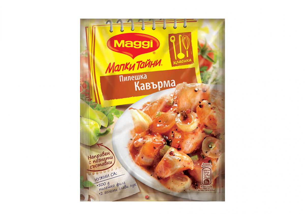 Състав: Сушени зеленчуци 28% (лук парчета и на прах, чесън на прах), модифицирано картофено нишесте, готварска сол, ароматизанти*, малтодекстрин, пшенично брашно**, захар, частично хидрогенирана палмова мазнина, подправки, съдържа глутен, лактоза и млечен протеин.