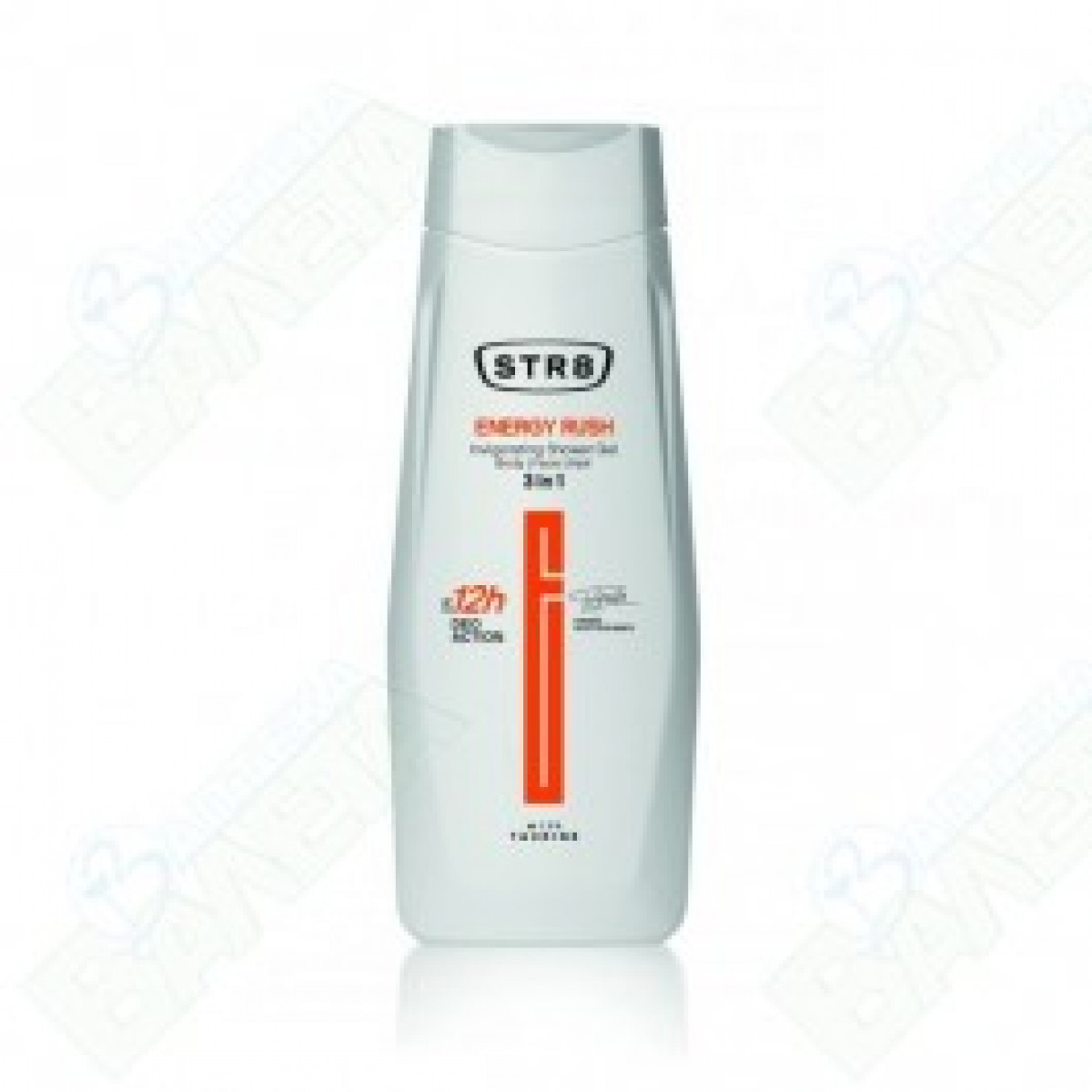 STR8 Energy Rush Invigorating Shower Gel 3in1 е душ-гел за мъже, който ще ви зареди с енергия в началото на деня. Неговата 3в1 формула е подходяща за почистване на лицето, тялото и косата. Включеният таурин действа тонизиращо и енергизиращо. Добавеният глицерин има хидратиращи и противовъзпалителни свойства. STR8 Енерджи Ръш Енергизиращ душ-гел 3в1 за мъже за тяло, лице и коса осигурява 12-часово дезодориращо действие, което се дължи на включената специална технология, която неутрализира неприятните миризми, предизвикани от изпотяване и бактерии. Душ-гелът има изразен мъжествен аромат, който създава дълготрайно усещане за чистота. Той комбинира свежи цитрусови и топли дървесни нотки с ориенталското ухание на подправки. Подходящ за всеки тип кожа и за ежедневна употреба. Дерматологично тестван продукт.