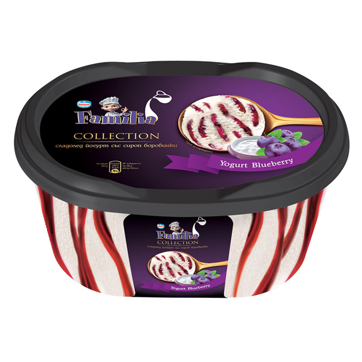 Състав: възстановено сухо обезмаслено мляко, вода, захар, глюкозен сироп, кокосово масло, суроватка на прах (от мляко), обезсолено краве масло (от мляко), сухо обезмаслено мляко, емулгатор (моно- и диглицериди на мастни киселини), стабилизатори (гума гуар, гума локуст бийн, преработени "Euchema" водорасли, гума ксантан, гума арабика), ароматизанти (съдържа ванилин), сироп боровинка, Може да съдържа : глутен, яйца, соя и ядки.