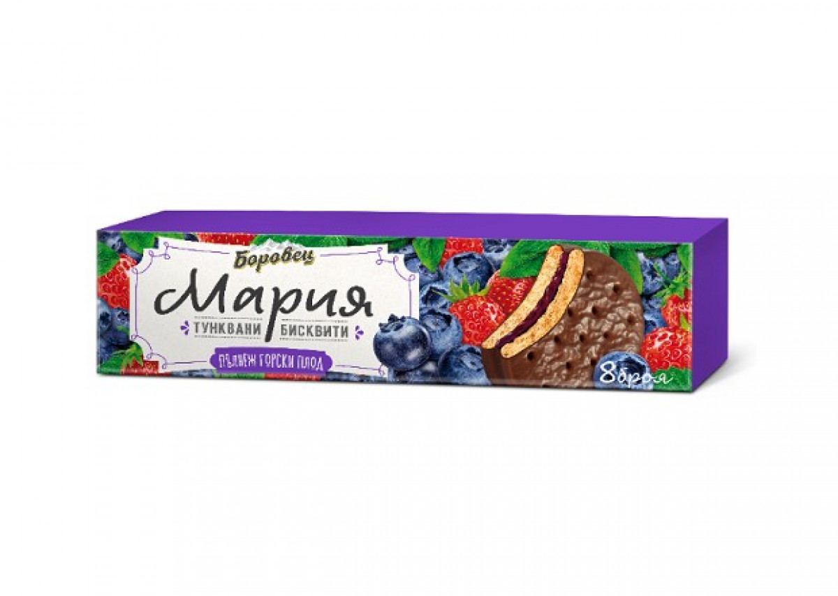 Състав: пшенично брашно, плодов пълнеж горски плод 24% [глюкозо-фруктозен сироп, боровинки 15%, ягоди 10%, ябълково пюре, захар, сгъстител: нишесте, желиращ агент: пектин, регулатор на киселинност: лимонена киселина, консервант: калиев сорбат, оцветител: антоцианин, ароматизант], какаова глазура 24% [захар, растително масло (палмово), обезмаслено мляко на прах, какао на прах с намалено маслено съдържание 2%, суроватка на прах, емулгатор: соев лецитин, ароматизант], захар, растително масло (палмово), глюкозен сироп, обезмаслено мляко на прах, набухватели (натриев хидроген карбонат, амониев хидроген карбонат), емулгатор: естери на моно- и диацетилна винена киселина с моно- и диглицериди на мастни киселини, сол, аромати.