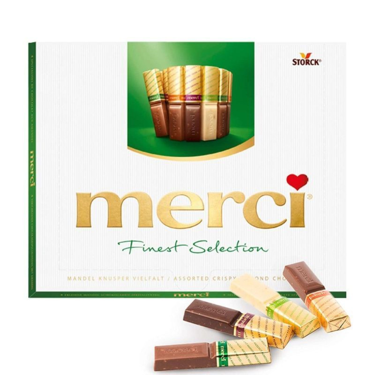 Бадемова селекция бонбони "Merci"с 4 фини шоколадови специалитета с Бадеми (9.2%) :фин млечен шоколад с лешници и Бадеми, бял с хрупкави Бадеми, тъмен сметанов шоколад с Бадеми, фин млечен с хрупкав мед и Бадеми.