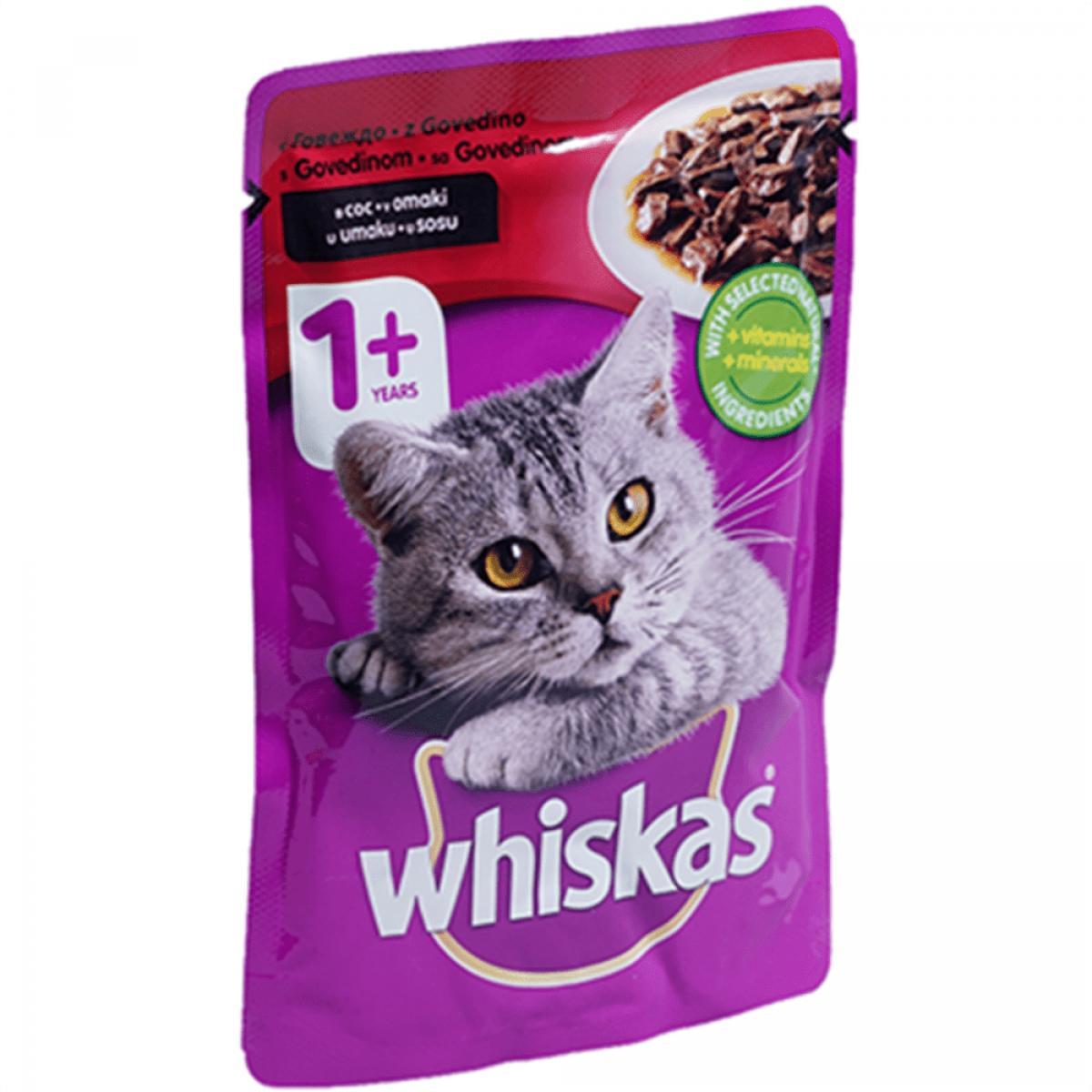 Мокра пълноценна храна за котки в зряла възраст с говеждо месо.
