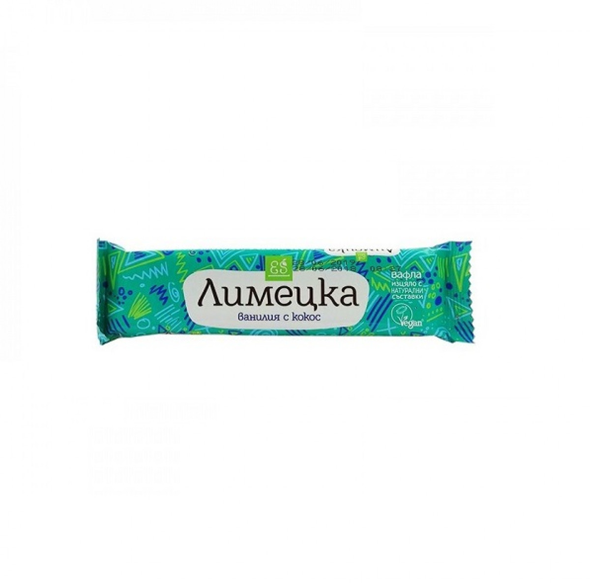 Хрупкава вафла с кори от лимец и богат крем от кокосови стърготини и малко слънчогледов тахан. Произведена от хора, които си разбират брашната и имат дългогодишен опит в тази област - Екосем. Вместо соеви и животински продукти, те са предпочели кокосово масло и слънчогледов тахан за своята вафла "Лимецка", а кремът е сгъстен с тиквено брашно и брашно от лимец. Подсладена е с нерафинирана захар. Съдържа също естествен антиоксидант - екстракт от розмарин. Насладете й се за десерт или за междинно похапване, съчетано с чаша чай или кафе!