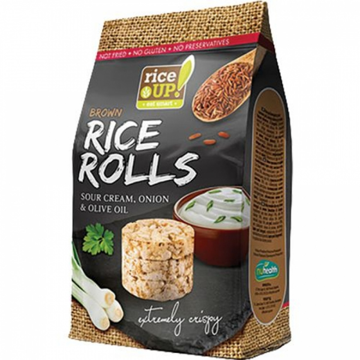 Състав: пълнозърнест кафяв ориз 74%, зехтин 18%, аромат 8% (натурален аромат, сол, картофен малтодекстрин, пшеничен малтодекстрин, сметана, захар, сирене 6%, лук 5%, магданоз 2,5%, пшеничен глюкозен сироп, регулатори на киселинността: лимонена киселина и натриев фосфат, оцветители: капсантин и червен пипер олеорезин).