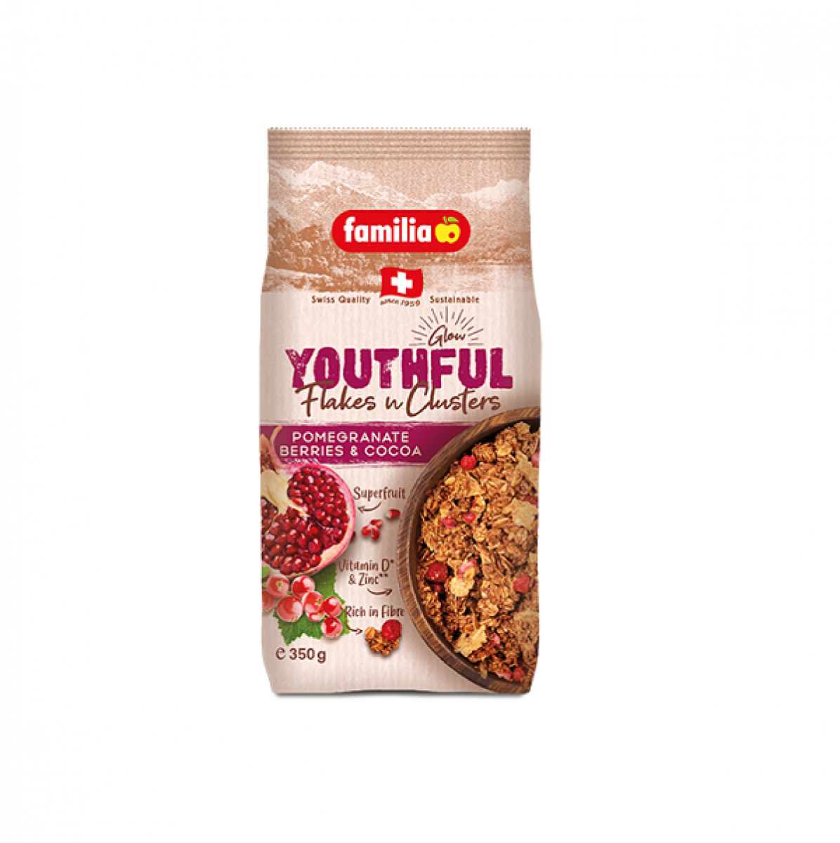 Състав: Пълнозърнеста пшеница 16,9%, пълнозърнесто пшеничено брашно 13,9%, глюкозен сироп, ориз 12,3%, захар, парченца млечен шоколад 7,0% (захар, пълномаслено мляко на прах, какаово масло, какаова маса, суроватка на прах, обезмаслено мляко на прах, емулгатор: соев лецитин, ароматизант), пълнозърнест овесен флейкс 5,39%, сироп на инвертна захар, влагозадържащи агенти: глицерол, сорбитолов сироп; малцов екстракт от ечемик, кокосово масло, калциев карбонат,нар, червени плодове, царевичен грис 0,9%, оризово брашно 0,8%, сол, малцов екстракт от ечемик (ечемик, малцов ечемик), слънчогледово масло, нискомаслено какао на прах 0,4%, ароматизанти, какао на прах 0.3%, емулгатор: слънчогледов лецитин, меласа, антиоксидант: токофероли, елементарно желязо, регулатор на киселинността: лимонена киселина, витамин B3 (ниацин), витамин B5 (пантотенова киселина), витамин B6 (пиридоксин хидрохлорид), витамин B9 (птероилмоноглутаминова киселина), витамин B2 (рибофлавин). Може да съдържа ядки.