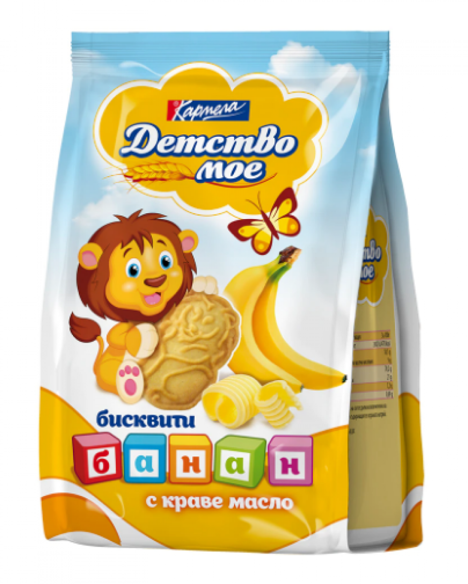 Състав: Пшенично брашно, захар, царевично нишесте, краве масло 8%, растителна мазнина палмова, сухо пълномаслено мляко 1,6%, набухватели: амониев бикарбонат, натриев бикарбонат, ароматизант, декстроза, калциев карбонат, витамин В1, витамин В2, витамин В6, витамин В9, витамин В12. Може да съдържа соево брашно, яйчен меланж.