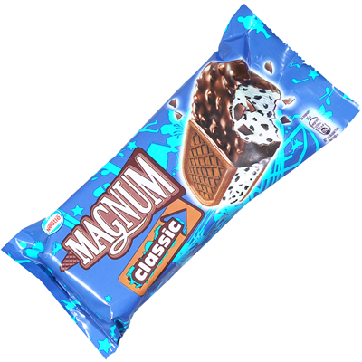 Ванилов сладолед с парченца млечен шоколад (6,5%) и сироп млечен шоколад (6,5%) (0,5% млечен шоколад в сиропа), във вафлена фунийка (12%), покрит с млечен шоколад (12%)