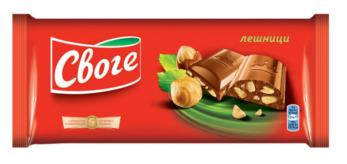 Съставки: захар, какаова маса, какаово масло, парченца обезмаслено МЛЯКО на прах, суроватка на прах (от МЛЯКО), парченца ЛЕШНИЦИ 8%, растителни мазнини (палмова, от ший), дехидратирана МЛЕЧНА мазнина, емулгатори (СОЕВИ лецитини, Е476), ароматизант. Млечният шоколад съдържа минимум 25% какаова маса. Млечният шоколад съдържа растителна мазнина в добавка към какаовото масло.