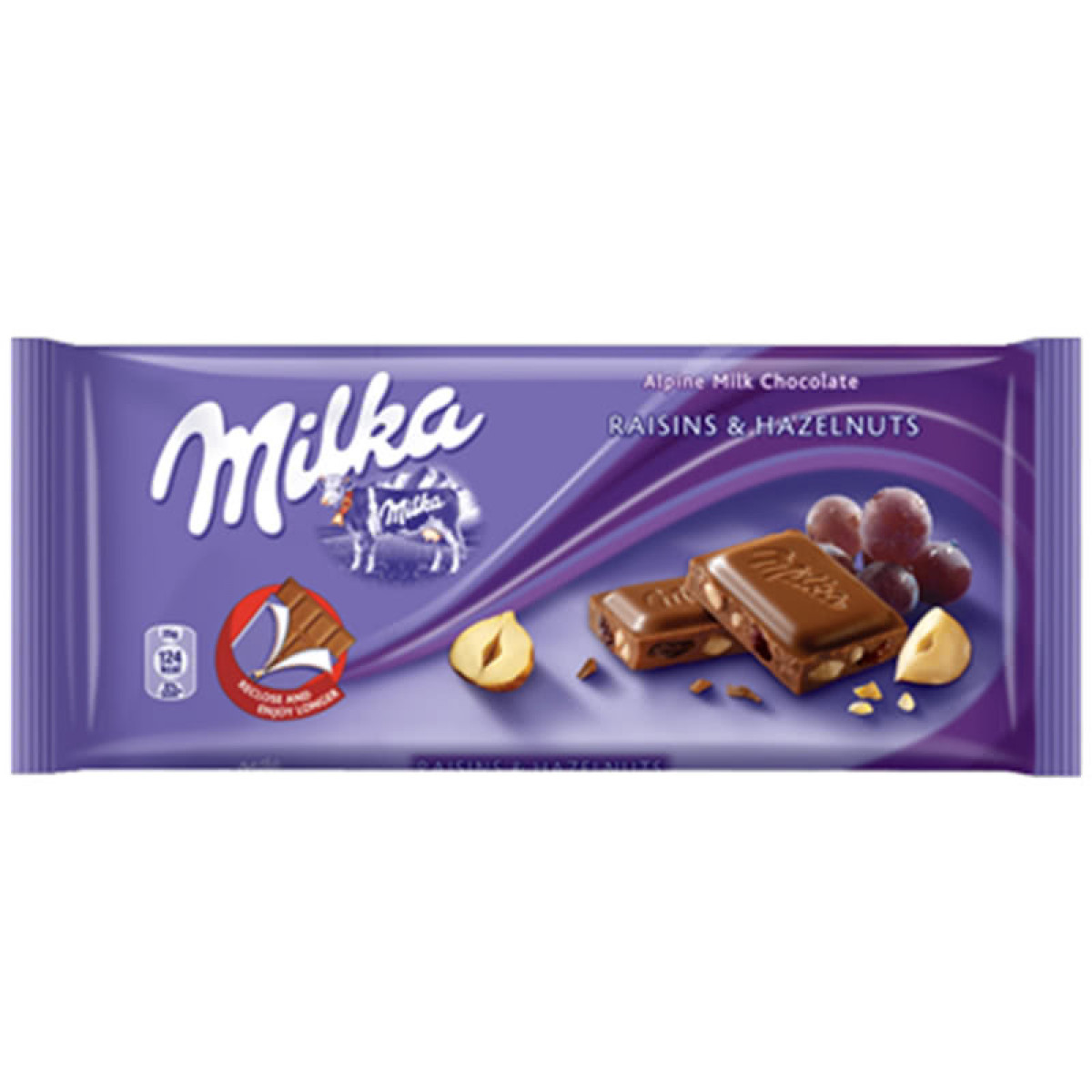 Състав: МЛЕЧЕН шоколад 40%(захар, пълномаслено сухо МЛЯКО, какаово масло, какаова маса, емулгатор, лецитини(СОЯ), ванилин, захар обезмаслено сухо МЛЯКО(18%), стафиди, лешници, палмово масло, обезводнено МАСЛО, емулгатор, лецитини(СОЯ), ванилин, общо МЛЕЧНИ компоненти 33%, общо какакови компоненти 13%.